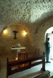 Way of Sorrow- Fifth Station. – As the inscription above the door of this Franciscan chapel says, here Simon of Cyrene took the cross from Jesus and carried it on to Golgotha. This is mentioned in three Gospels, but not in that of John. |
