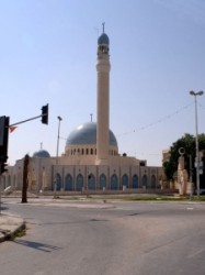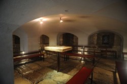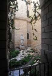 the Chapel of the Flagellation where tradition holds that Jesus was interrogated by Pilate. The Franciscans and Pilgrim's begin their weekly procession through the Stations of the Cross here, on Friday afternoons. This modest chapel was built on the site of a Crusader oratory. Inside are glass panel representing the scourging of Jesus (center), Pilate cleansing his hands of the blood of the innocent (left), and the liberation of Barabas (right).