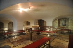 the Chapel of the Flagellation where tradition holds that Jesus was interrogated by Pilate. The Franciscans and Pilgrim's begin their weekly procession through the Stations of the Cross here, on Friday afternoons. This modest chapel was built on the site of a Crusader oratory. Inside are glass panel representing the scourging of Jesus (center), Pilate cleansing his hands of the blood of the innocent (left), and the liberation of Barabas (right).