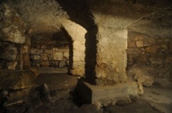 One can see the altar in the Chapel of Adam and the rock beneath the Golgotha. Adam’s skull was buried here. When Jesus was crucified and his body was nailed, his blood was dripping down from the cross and leaked through the cracked rock right on to the skull of Adam. |